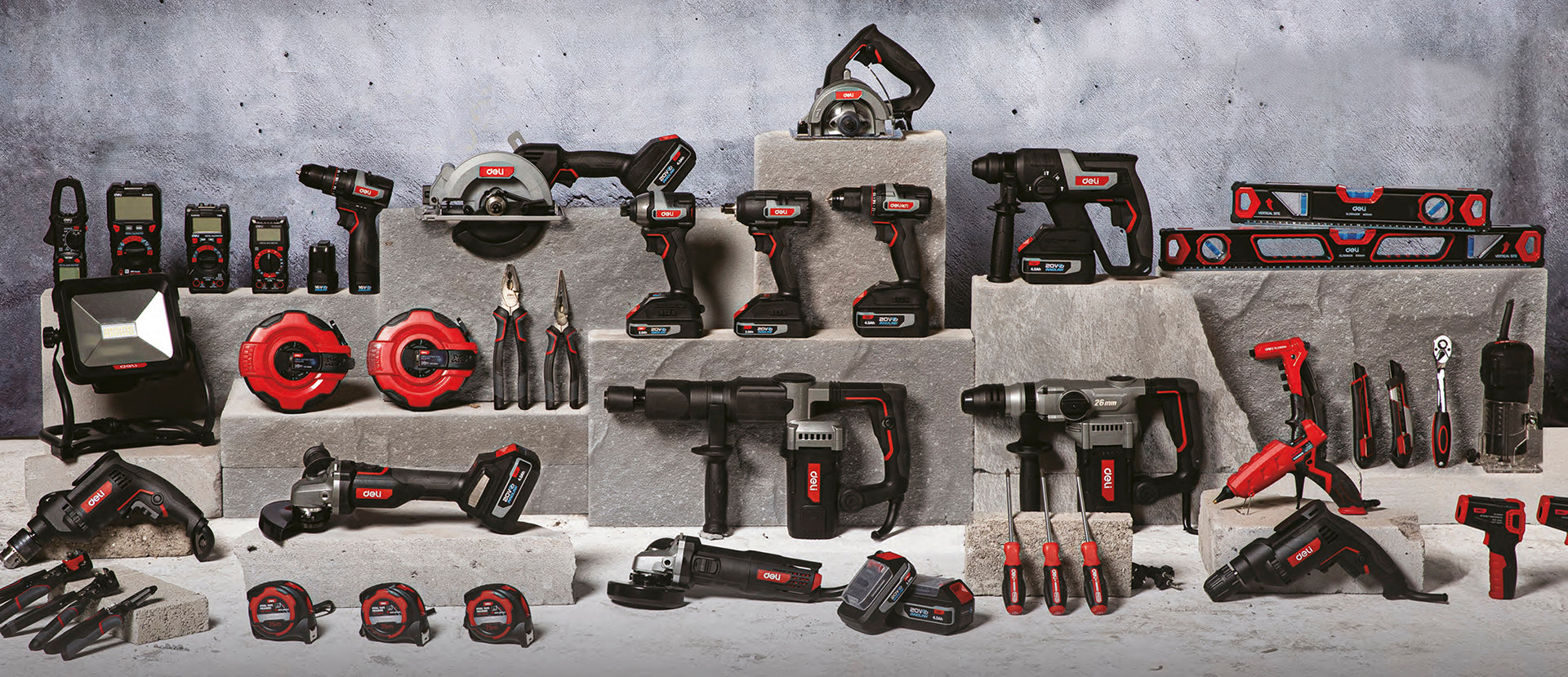 Deli Tools tarjoaa eri voima-, kestävyys- ja hintaluokan koneita ammatti- ja kotikäyttöön. Punainen ammattitason sarja tarjoaa yhtenäisen 20V-akkujärjestelmän, joka on suunniteltu päivittäiseen käyttöön ja lataamiseen.