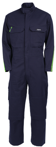 Edessä piilonapitus metallisilla napeilla / Kaksi rintataskua, rintataskun kansissa tarrat / Oikeassa rintataskussa kynävälikkö ja lokerikko puhelimelle / Rintataskussa riippuva henkilökorttitasku (pysty-/vaakakortille) / Riippuva vetoketjullinen povitasku / sivutaskut, joista pääsy sisäpuolelle /Kaksi takataskua, takataskun kansissa trenssit sivuissa / Polvitaskut ulkopuolella, polvitaskuissa kaksi korkeuden säätöä polvisuojille / Mittatasku / Kauluksessa tarrakiinnitys / Selässä tilaa antavat laskokset / Takavyötäröllä säädettävä kuminauha / Piilopainonapit hihansuissa / Lahkeensuissa pidennysvaraa / Takana selässä heijastin. Standardit: Suojavaatetus hitsaus- ja vastaavissa töissä EN ISO 11611 luokka 1 A1, Kuumuudelta ja tulelta suojaava vaatetus EN ISO 11612 A1 B1 C1 E2 F1,